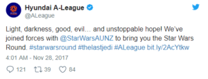 13 Aralıkta vizyona girecek Star Wars serisinin yeni filmi olan Star Wars: Last Jedi açıkladığı anlaşmayla Avustralya ulusal futbol liginde oynanacak 10’uncu hafta maçlarına isim ve içerik sponsoru olduğunu duyurdu. Hali hazırda ligin adı Hyundai A-League olarak geçse de ilgili maçlar Star Wars haftası olarak kayda geçecek.