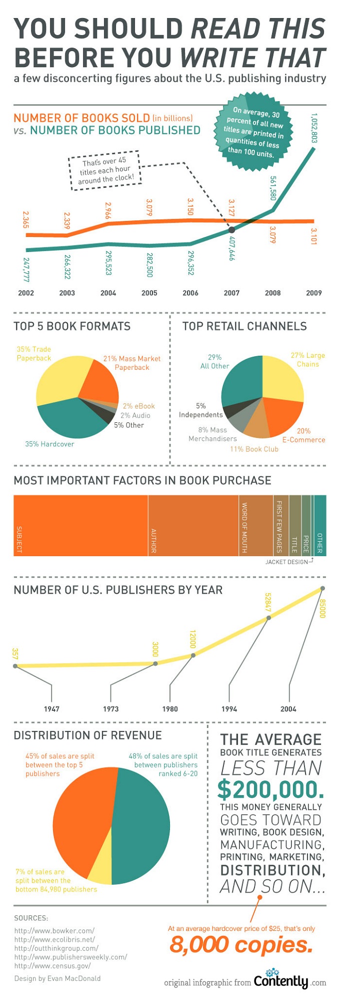 Eğer kitap yazmaya niyetliyseniz aşağıdaki grafikteki verileri bir daha inceleyin. Yeşil çizgi ABD’de yayınlanan kitap sayısını, turuncu çizgi ise okur sayısını gösteriyor.  2007’den sonra kitap sayısı patlarken okuyucu sayısında pek bir oynama yok.