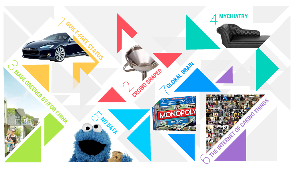 1- Suçluluk hissettirmeyen statü simgeleri: (Guilt-free status) Giderek daha fazla sayıda tüketici, tüketim alışkanlıklarının gezegene zarar verdiğinin farkına varıyor. Değiştiremedikleri tüketim alışkanlıkları ve ihtiyaçlarıyla suçluluk sarmalına giren bu tüketicilerin statü ihtiyaçlarını karşılamak, heyecan verici fırsatlar sunuyor. Örneğin lüks segment elektrikli otomobil Tesla, eski jean’lerden halı üreten Nudie gibi çevreyle dost statü sembolleri oldukça karlı bir pazar yaratıyor. Yapılan küresel bir araştırmaya göre (BBMG, GlobeScan and SustainAbility, Ekim 2013), dünyadaki tüketicilerin üçte birine yakın bölümü “Sorumlu tüketim”i destekliyor.
