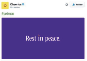 Cheerios, Prince’in ölümünden sonra bu fotoğrafı paylaştı. Öfkeli tüketiciler, prensin ölümünü markaya dikkat çekmek için bir pazarlama aracı olarak kullanmaktan dolayı şirkete tepki gösterdi. Cheerios daha sonra bunu kaldırdı ve bir özür yazısı yayınladı. Ancak hata bir kere yapılmıştı.