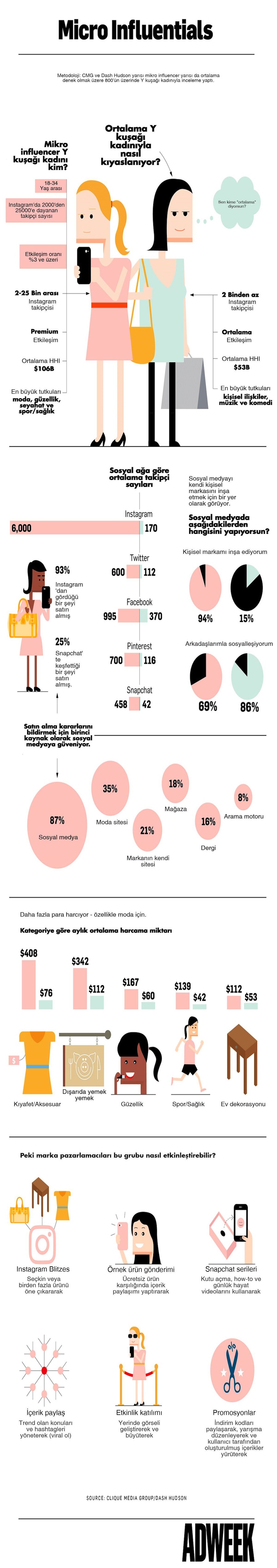 Clique Media Group, pazarlamacıların bu değerli kesime nasıl ulaşacaklarını daha iyi anlamalarına yardımcı olmak, mikro influencer, Y kuşağı kadınının tam olarak kim olduğunu ve ortalama Y kuşağı kadınıyla kıyasla nasıl olduğunu bulmak için Instagram analiz platformu, Dash Hudson’la işbirliği yaptı. Clique Media Group CEO’su Katherine Power konuyla ilgili, “Bu yeni dönem influencerlar ve onların perakende satış ve markalara olan etkisini anlamak için biraz yüzeysel kalıyoruz. Yine de, influencerlar akranlarına olan etkisinin çok hızlı bir şekilde yükseldiğini ve geliştiğini kesin olarak biliyoruz.” dedi ve ekledi; “Mikro influencerlar; giyim, aksesuar, dışarıda yemek yeme ve güzelliğe, ortalama bir Y kuşağı kadınından daha fazla para harcadığı için, kendi içlerinde de değerli bir hedef.”