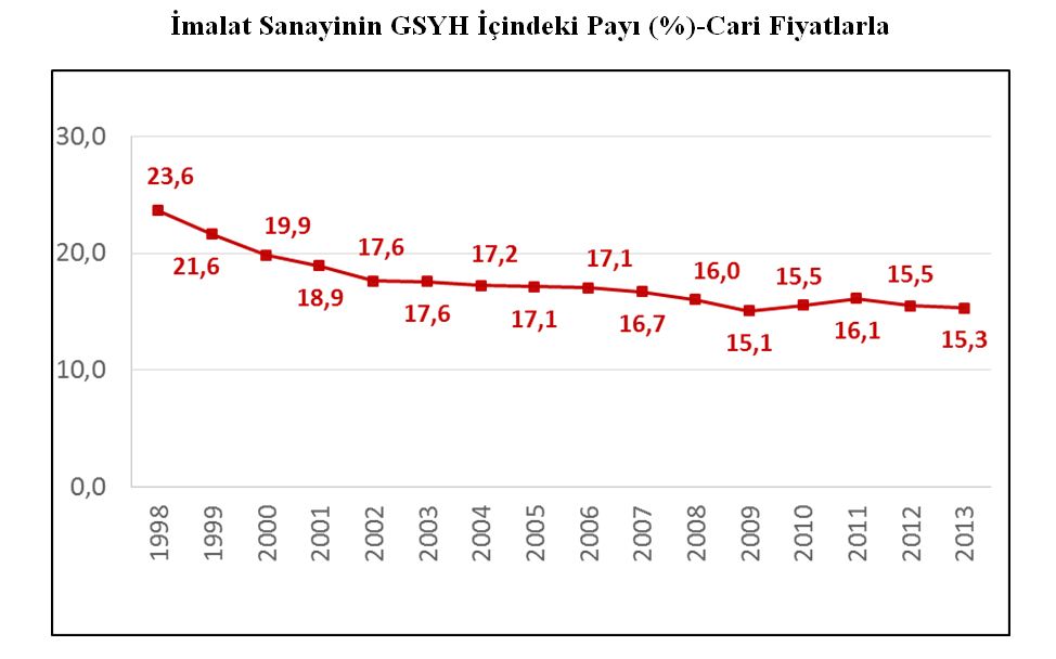 Haftanın ikinci açıklaması ise İstanbul Sanayi Odası’nın (İSO) her yıl gerçekleştirdiği 500 Büyük Şirket araştırmasının sonuçlarının açıklanması vesilesiyle Yönetim Kurulu Başkanı Erdal Bahçıvan’dan geldi. Bahçıvan, toplantıda yaptığı konuşmada sanayinin hak ettiği noktadan çok uzak olduğunu belirterek, son 15 yılda GSYİH içinde sanayinin payının sürekli gerilediğine dikkat çekti. Gerçekten de İSO’nun açıkladığı verilere göre 1998’de sanayi sektörünün GSYİH içinde yüzde 23,6 olan ağırlığı 2013’te yüzde 15,3 düzeyine gerilemiş durumda.