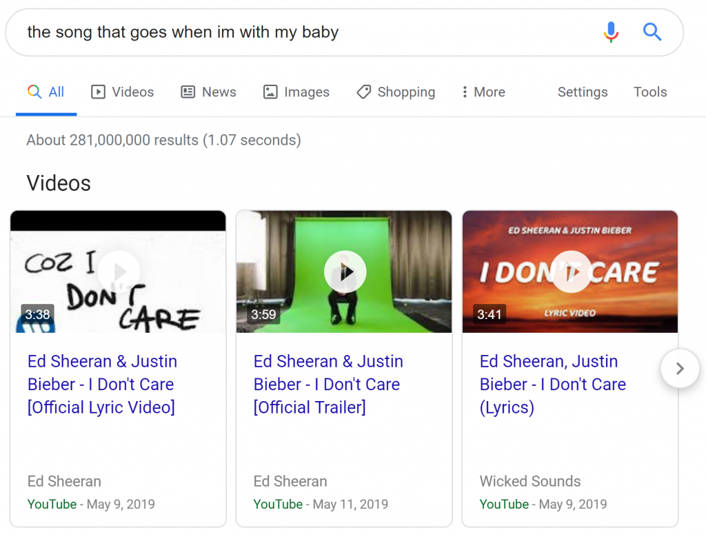 Bu, sitelerin edinime değil süper hayranlara bırakıldığı anlamına gelir. Şarkı sözleri veya set listeleri konusunda uzmanlaşmış siteler için fırsatlar yarattı, böylece hangi sanatçının  tek bir satırla hatırladığınız şarkısını öğrenebilirsiniz. Google bunu fark etti ve tek bir satırla  gerçek şarkıyla eşleştirme konusunda oldukça başarılı.