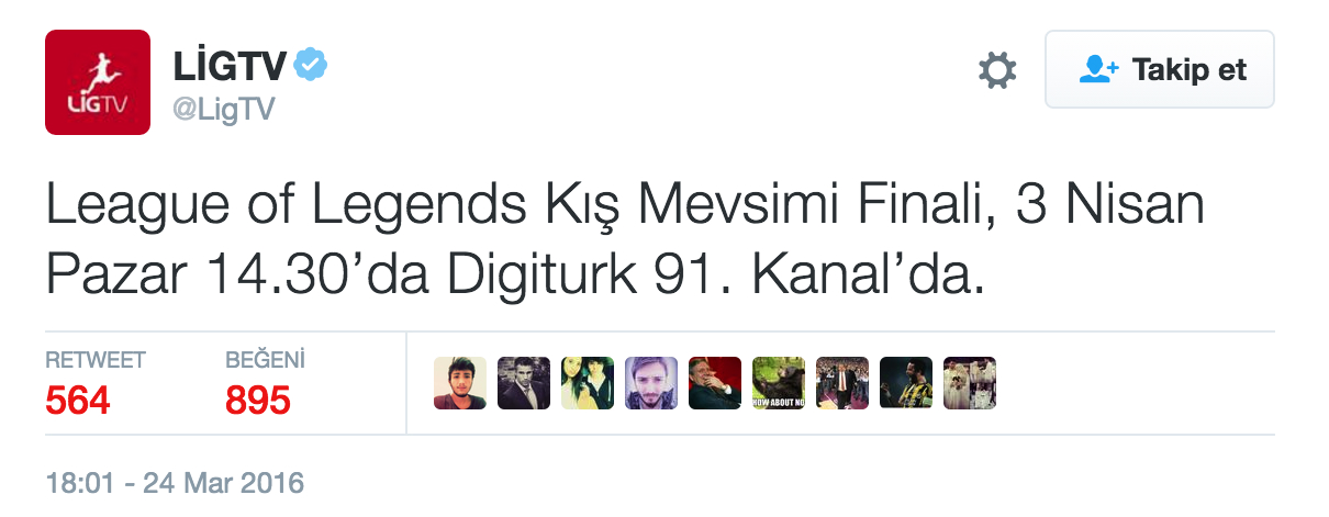 Lig TV’nin resmi Twitter hesabında duyurduğu haber ile eSpor severlerin yüzü güldü. Dünyada ve Türkiye’de çok büyük bir kitleye sahip olan League of Legends’ın bu sene, Türkiye ligi adına düzenlenen 2016 Kış Mevsim Finali Digitürk’ tarafından 3 Nisan günü naklen olarak yayınlanacak. Daha önce hiç bir zaman paralı bir kanalda yayınlanmayan ve internet ağları olan Twitch ile YouTube kanalları üzerinden yayını yapılan Kış Mevsim Finali, ilk defa bir kanalda yayınlanacak. Elektronik sporun önemi dünyada olduğu gibi Türkiye’de de azımsanmayacak bir kitleye hitap ediyor, binlerce insan bu müsabakaları ekranları başından canlı yayın ile izliyor.lig tv twitter