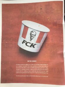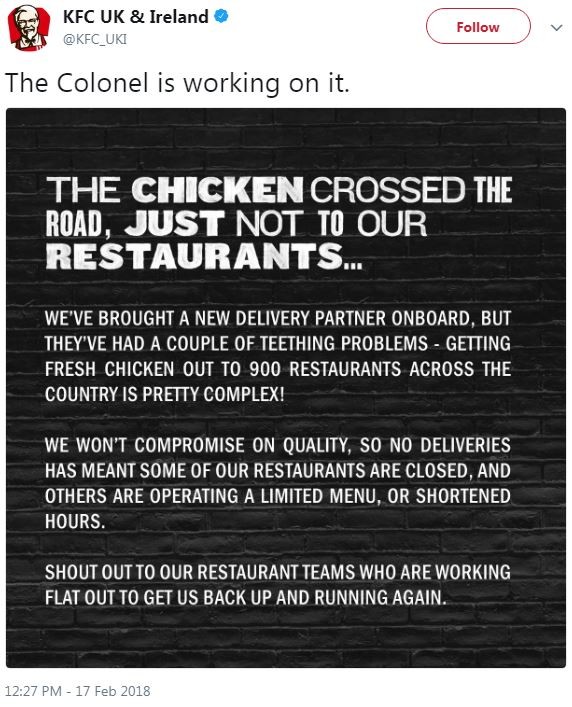 Global fast food zinciri Kentucky Fried Chicken, taze tavukları dağıtma yöntemlerini değiştirdikten sonra şubelerine tavuk yetiştirmeyi başaramayarak, İngiltere’deki toplam şubelerinin yarısından fazlasını geçici olarak kapatmak zorunda kalmıştı. Şirketin bu duruma verdiği tepki ise mükemmel bir iletişim becerisi örneğiydi.