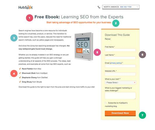 Yandaki resim Hubspot’un “Learning SEO (Arama Motoru Optimizasyonunu Öğrenmek)” isimli e-kitabı için oluşturmuş olduğu tanıtım sayfasının bir ekran görüntüsünü göstermektedir.  Bu sayfa 7 temel elementi içermektedir: