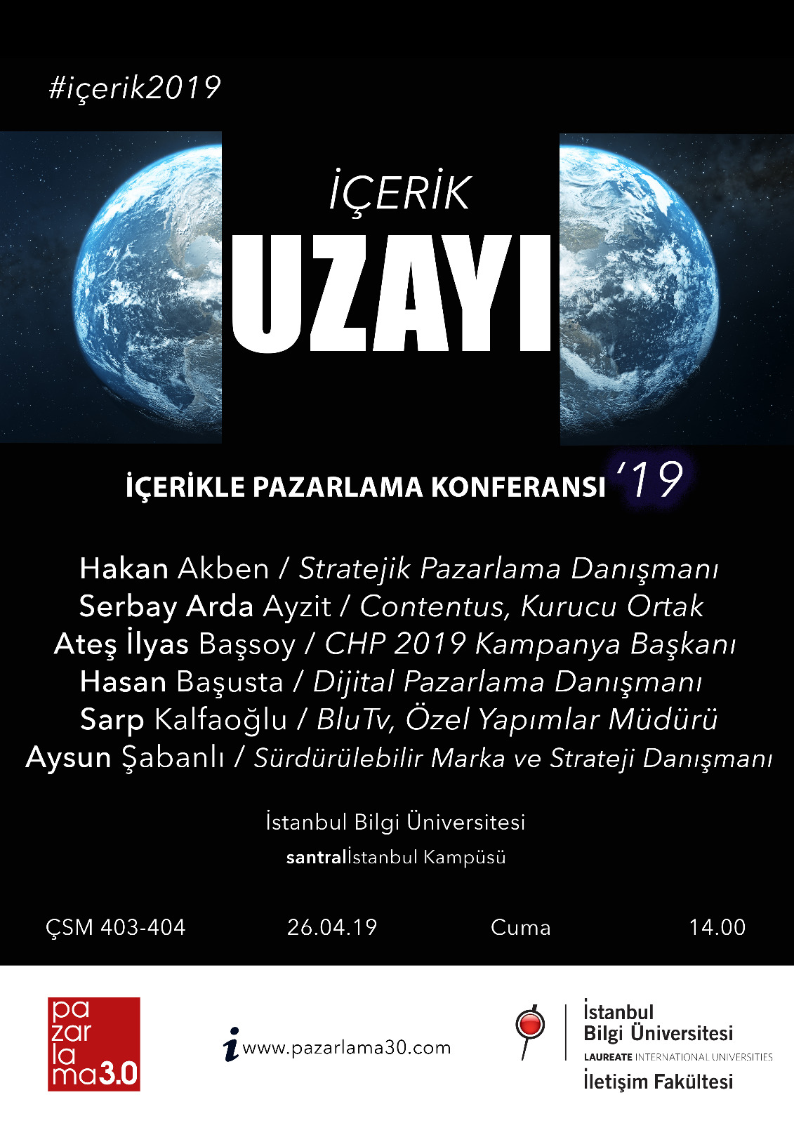İstanbul Bilgi Üniversitesi İletişim Fakültesi tarafından her yıl düzenlenen İçerikle Pazarlama Konferansı’nın dördüncüsü bu yıl “İçerik Uzayı” başlığıyla, 26 Nisan Cuma günü Santralistanbul Kampüsü’nde gerçekleştirilecek. Bu yılki temasıyla içerik pazarlamasının sunduğu olanakların sınırsızlığına vurgu yapan konferansta, sosyal medyada gerçek zamanlı pazarlama, aktivizm döneminde pazarlama toplulukları ve siyasi pazarlamada içeriğin yeri gibi konular tartışılacak.