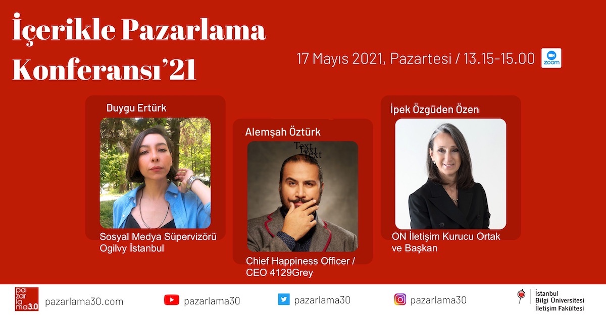 BİLGİ İletişim Fakültesi Medya Bölümü’nde Pazarlama 3.0 ekibi tarafından düzenlenen konferans, 17 Mayıs’ta Zoom üzerinden canlı olarak yayınlanacak. Konferansta, pandemi sonrası koşullarda içerik üretimi ve içerik pazarlaması, hikaye anlatımı ve spor iletişiminde içerik üretimi konuları masaya yatırılacak. Saat 13:15’te başlayacak konferansın bu yılki konuşmacıları 4129Grey CEO’su Alemşah Öztürk, ON İletişim Kurucu Ortağı ve Ajans Başkanı İpek Özgüden Özen, Ogilvy İstanbul Sosyal Medya Süpervizörü Duygu Ertürk.