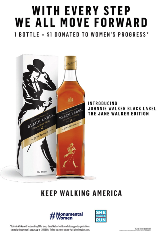 Johnnie Walker’ın sahibi olan Diageo firması, Jane Walker’dan elde edilen gelirin bir kısmını ve ayrıca 150.000 doları Monumental Women (New York’ta Central Park’a oy kullanma hakkı için mücadele veren Amerikan kadınlarını temsil eden bir anıt dikmek amacı taşıyan bir sivil toplum girişimi) kuruluşuna bağışlayacak. Ayrıca kadınların politikada daha etkin görev almaları için kurulmuş “She Should Run” isimli sivil toplum örgütü de  Diageo’nun bağış yapacağı bir diğer kurum olarak öne çıkıyor. Her Jane Walker şişesinden elde edilen gelirin 1 dolarını kadın hakları örgütlerine bağışlayacağını açıkladı. Sadece 250 bin şişe üretileceğinden 250 bin dolarlık bir bağış olacağı belirtildi.