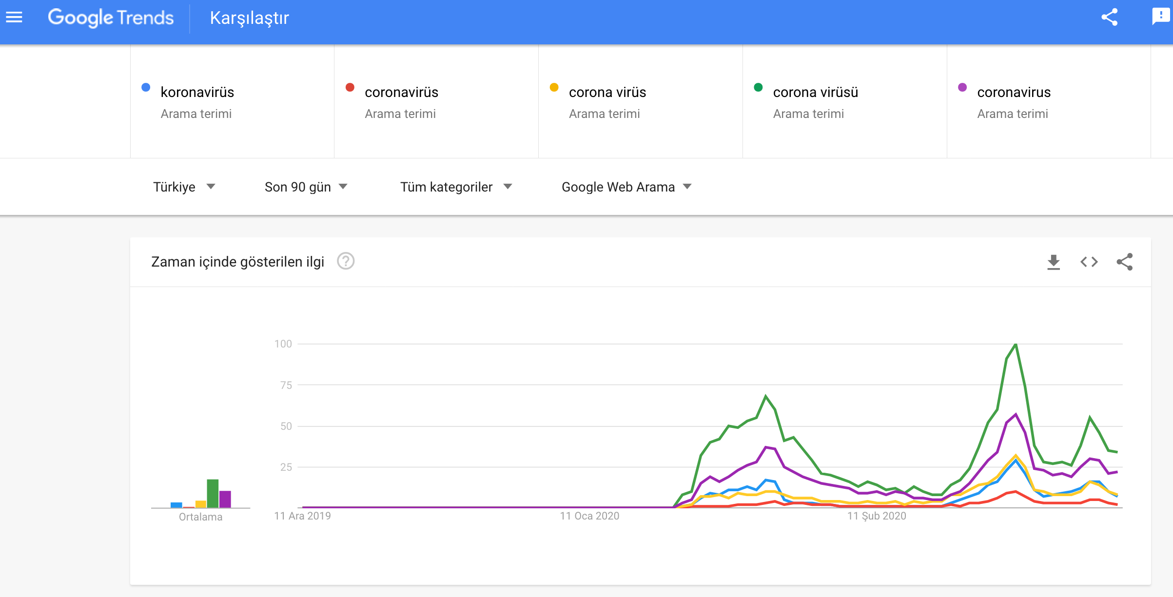 Sayfada yer alan görseller 11 Mart 2020 itibariyle Google Arama Trendleri sayfasından indirilen grafikleri yansıtıyor. Resimlerin üzerine tıkladığınızda gerçek zamanlı olarak her bir sorgu icin oluşturduğumuz sayfalara ulaşabilirsiniz. Sorgu terimlerinin detaylarını öğrenmek isterseniz üzerlerine tıklayabilir. Yeni sorgu grafikleri oluşturabilir, istediğiniz terimleri değiştirerek sorgular arasında karşılaştırma yapabilirsiniz.