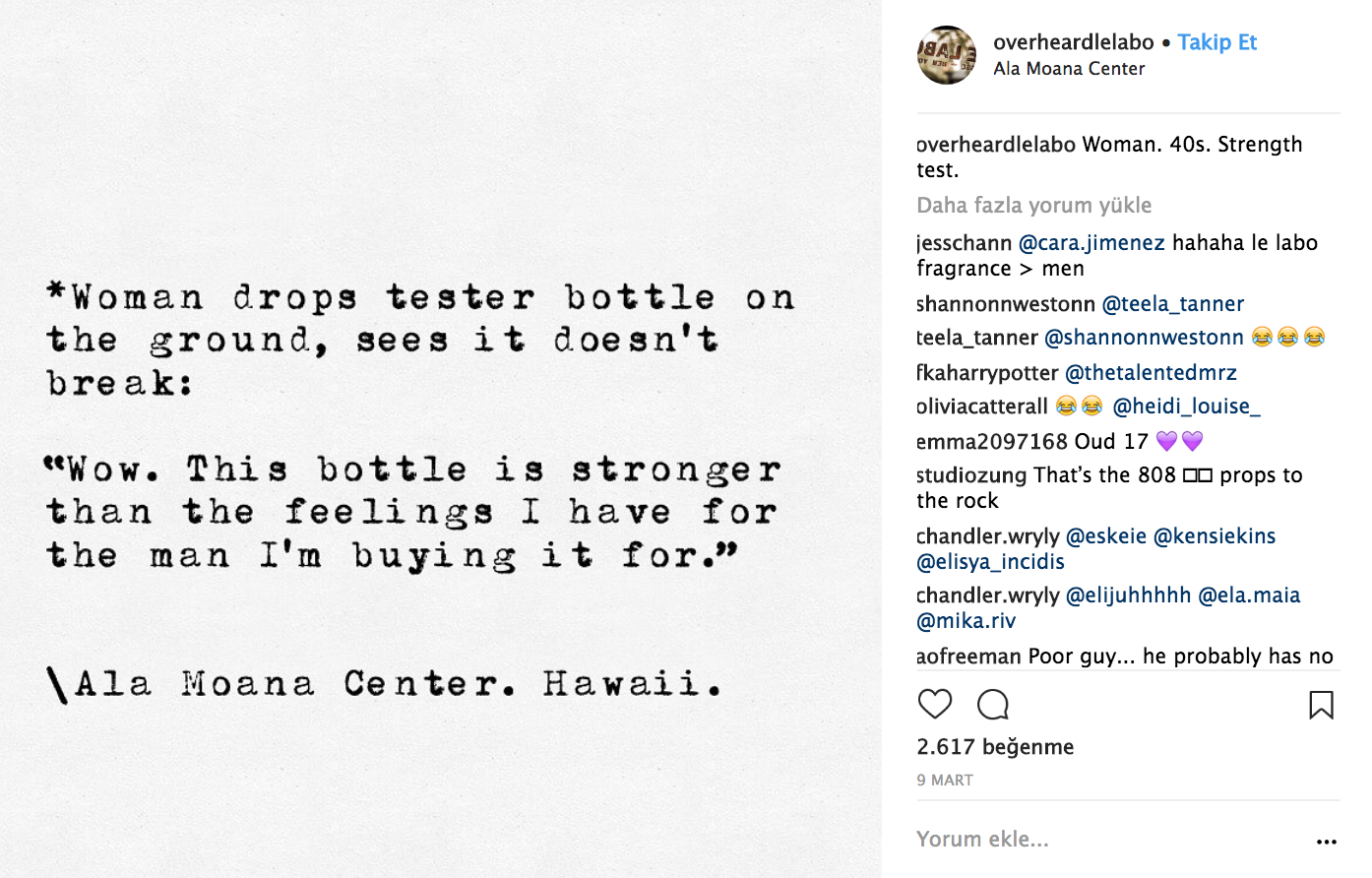 Jesse Margolis birkaç senedir, Los Angeles’ta etrafındaki muhabbetlere kulak misafiri oluyor ve duyduklarını olduğu gibi yazarak LA kültürünün en absürt yönlerini, OverheardLA isimli Instagram ve RealOverheardLA isimli Twitter hesaplarında paylaşıyor.