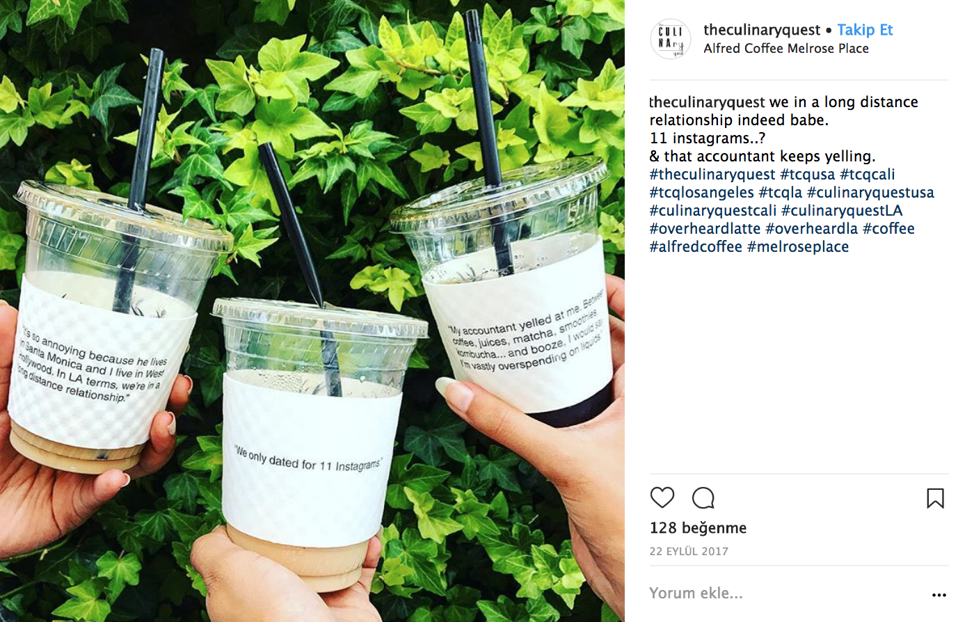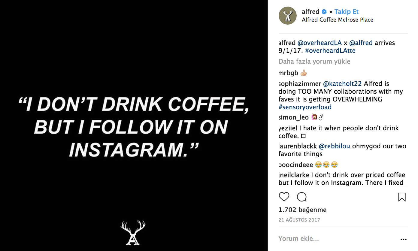 Los Angeles’ta yaygınca bilinen Alfred Coffee ile yaptıkları bir Instagram iş birliği ve kahve bardakları: