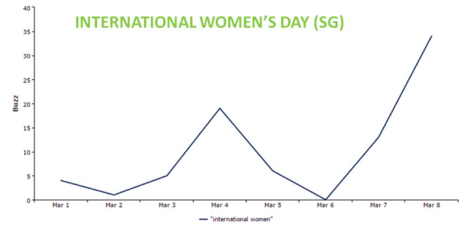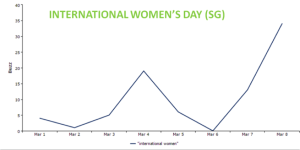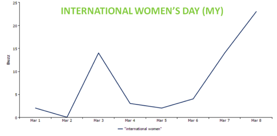 Medya izleyicisi bir ajans olan Isentia’nın sunduğu istatistiklere göre, Singapur ve Malezya’da hafta ortası ve bugün de (8 Mart) Dünya Kadınlar Günü’nün internette popülerliği zirve yapmış durumdadır. Bu hareketlilik 1-8 Mart aralığında medya izleme araçlarıyla gözlenmiştir.