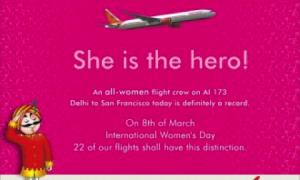 #SaluteWomen (#KadınaSelamOlsun) felsefesi doğrultusunda, Air India Delhi’den San Francisco’ya kadar sürmüş olan dünyanın en uzun soluklu yalnız kadınların olduğu uçuşu gerçekleştirmiş ve dünya rekorunu kırmıştır.