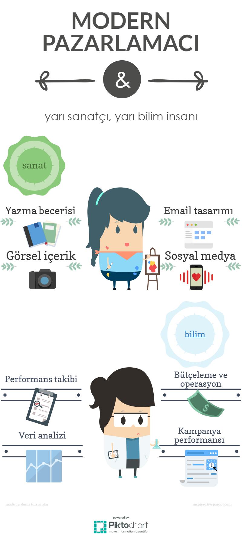 Kısa süre içerisinde pazarlama değişime uğradı. Hatta şimdi modern pazarlamaya yeni standart olarak bakıyoruz. Artık pazarlamacılar sadece fikirlerle ortaya çıkıp gerçekleşmesi için tasarımcılara paslamıyor. Modern pazarlama, pazarlamacının rolü ile yaratıcı ekibin rolünü birbiriyle harmanlıyor. Bu demek oluyor ki, ekibinizde elinden her iş gelen – yaratıcı, sosyal medyadan anlayan, aynı zamanda kendi çabalarını idrak etme, izini sürme ve ölçme becerisine sahip birileri olacak.