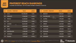 Ocak 2021’den itibaren Pinterest global aktif kullanıcı sıralamasında dünyanın en büyük 14. Sosyal ağ platformu.