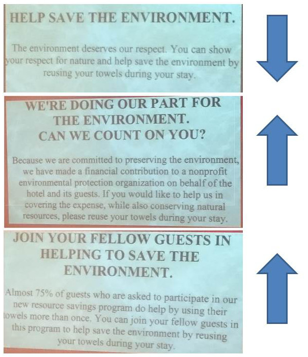 Cialdini’nin iknanın psikolojisi ile ilgili bir başka örneği ise Amerikan otellerinde gerçekleştirdiği “Havlu ve çarşafları yeniden kullanma çalışması”. Otel odalarında çarşaflarını değiştirmek isteyen müşteriler için “Çarşaflarımı ve havlularımı değiştir” ibaresi bulunan kartların üzerine, “Daha az değiştirin, çevreyi koruyun” şeklinde ibareler yerleştiriliyor. Bu ibarelerin kişiler üzerinde pek bir etkisi olmadığı gözlemleniyor. Cialdini, karşılıkta bulunma taktiğiyle bireyleri ikna etmeyi başarıyor. Kişilerin her ne kadar çevreyi korumak istediklerini düşünseler de bunu davranışa geçirmekte zorlandıklarını daha önce San Diego’da yaptığı “Enerji Tasarrufu” anketinde olumlayan Cialdini, otel odalarında bulunan kartların üzerine “Çevreyi korumak için biz şu miktarda bağış yaptık. Siz de havlu ve çarşaflarınızı yeniden kullanarak bize destek olun” şeklinde yazılar yerleştirilmesini istiyor. Beijing Restaurant örneğinde de olduğu gibi, her şeyi karşı taraftan beklemeyip, kişilere gerçek bir şeyle gittiklerinde olumlu sonuçlar almaya başlıyorlar. İnsanların kartlardaki yazıları okuma ve buna göre davranma oranları artıyor. Kendilerini iyi bir şeyin parçası olarak hissediyor ve buna göre tutum sergiliyorlar.