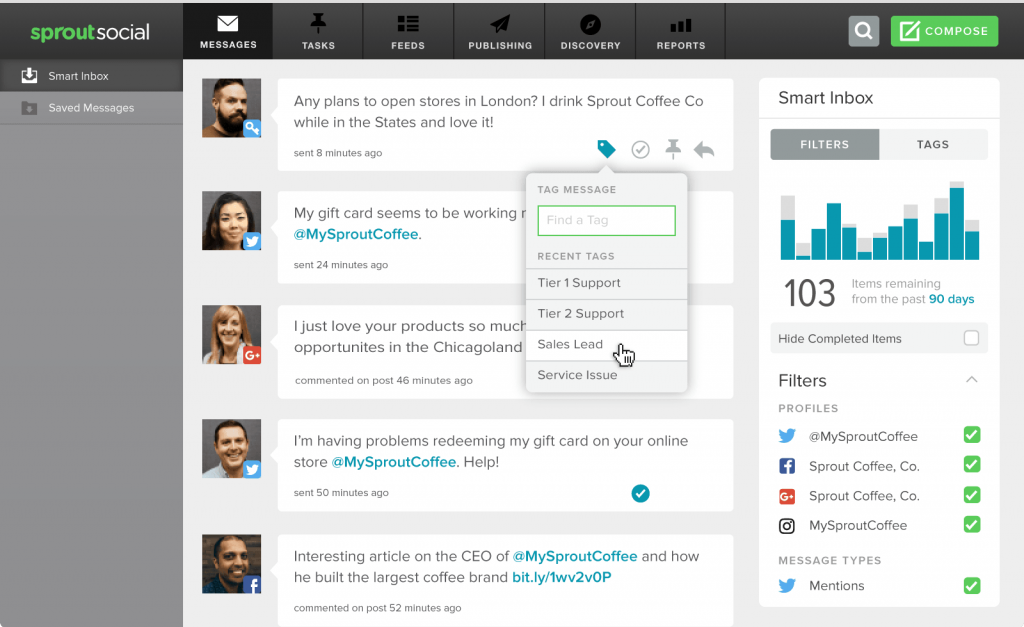 Hootsuite gibi Sprout Social, her ağda çoklu profilleri senkronize etmenize olanak tanıyan çok iyi bilinen bir sosyal medya gösterge tablosu ve hesap monitörü. sproutsocialAslında Sprout Social’u Hootsuite’ye tercih ediyorum çünkü bağlantılı hesaplar geniş bir yelpazeye sahiptir ve fiyatlandırma yapısı karmaşık ve sinir bozucu değil.