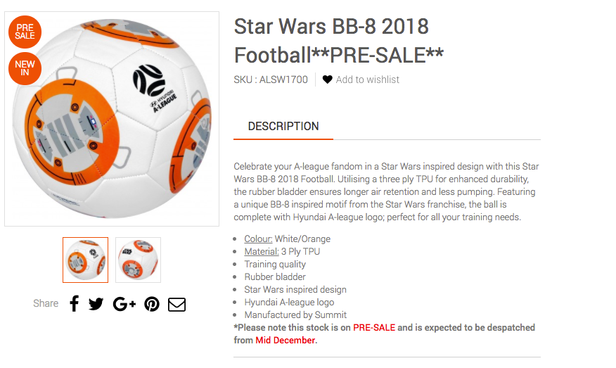 13 Aralıkta vizyona girecek Star Wars serisinin yeni filmi olan Star Wars: Last Jedi açıkladığı anlaşmayla Avustralya ulusal futbol liginde oynanacak 10’uncu hafta maçlarına isim ve içerik sponsoru olduğunu duyurdu. Hali hazırda ligin adı Hyundai A-League olarak geçse de ilgili maçlar Star Wars haftası olarak kayda geçecek.
