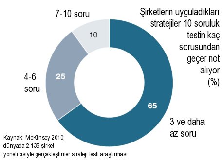 Moraliniz hemen bozulmasın diye şunu da ekleyelim, McKinsey’in küresel ölçekte 2 bin 133 üst düzey yöneticiyle yaptığı araştırmanın sonuçlarına göre şirketlerin çoğunluğunun sahip olduğu stratejiler, bu on soruluk testin dörtten daha az maddesinden geçer not alabiliyor. Araştırmanın sonuçları şöyle; şirketlerin yüzde 10’u bu on sorunun 7-10’undan geçer not alıyor. Yüzde 25’inin stratejisi bu on maddenin 4-6’sından geçiyor. Şirketlerin yüzde 65’inin stratejisi ise -veya sahip olduklarını düşündükleri strateji diyelim- bu soruların üç ve daha azından geçer not alabiliyor.