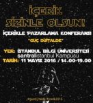İçerikle Pazarlama Konferansı’16 İçerik Sizinle Olsun Güç uyanalı çok oldu! Ve bu güce ayak uydurmaktan başka bir şansımız yok. Çünkü Güç Dijitalde artık. Bu yüzden de dijital çağın öncü isimlerini bir araya getiriyoruz… Yeni nesil pazarlama trendleri, dijital dünyada ayakta kalabilmenin sırları, içerik üretmenin püf noktaları, pazarlama alanında sosyal medya kullanımı gibi konuların tartışılacağı “İçerik…