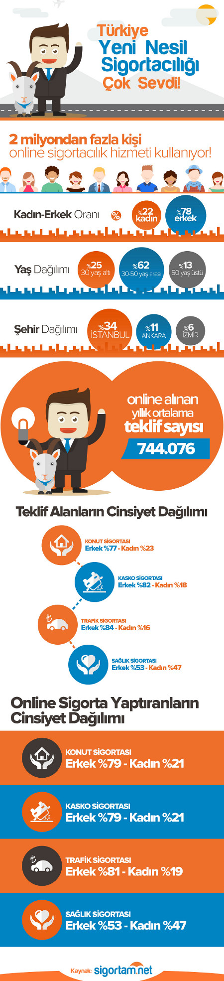 Sigortam.net üstünden online sigortacılık hizmeti kullananların yüzde 78’ini erkekler, yüzde 22’sini ise kadınlar oluşturuyor. 30-50 yaş arası online sigorta müşterileri yüzde 62 ile çoğunluğu temsil ederken, kullanıcıların yüzde 25’i 30 yaş altı, yüzde 13’ü ise 50 yaş üstü olarak belirtiliyor.