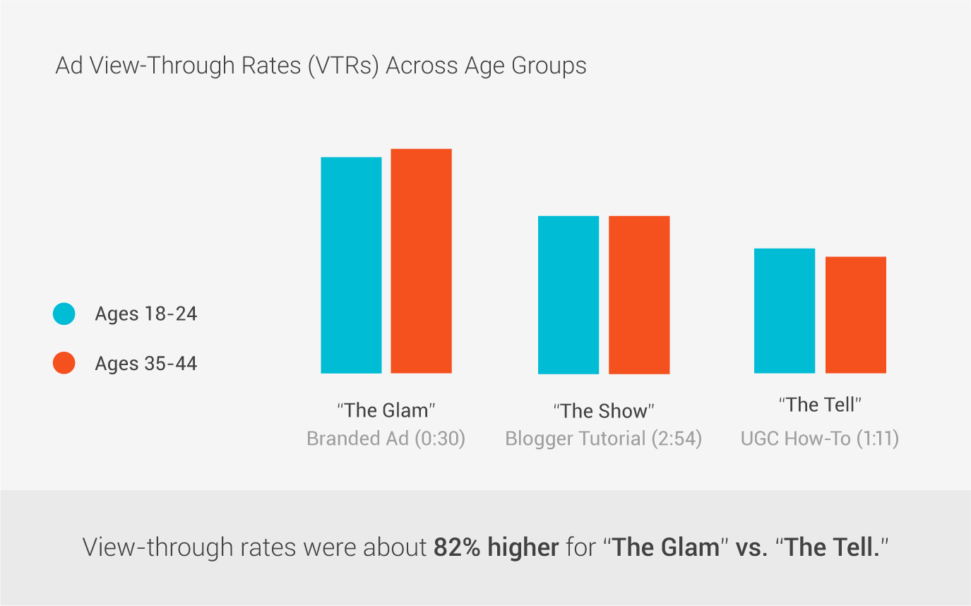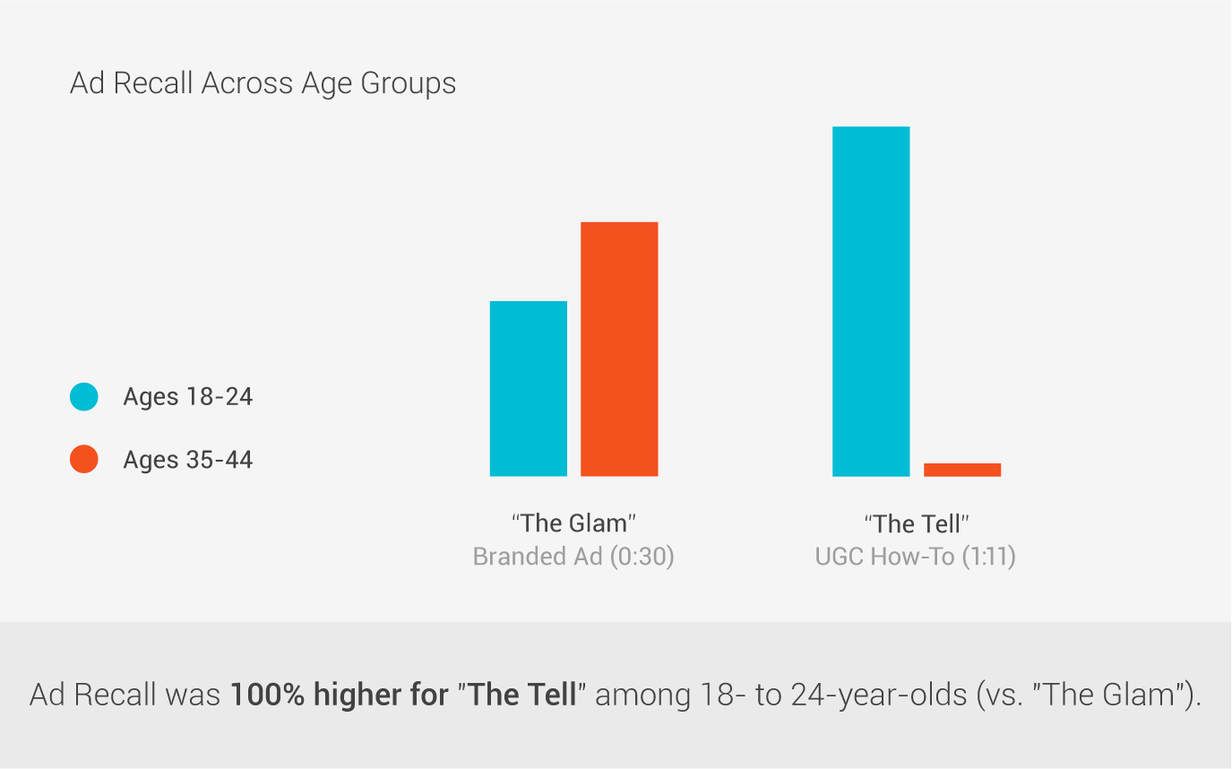 Bu tip videoları izlerken, cevap test ettiğimiz diğer üç reklamla aynı ancak markalara olan etkisi aynı değil. “The Glam” en çok daha yaşlı test izleyicileri için çalışıyor. Demografiklere göre 35-44 yaş grubu için 18-24 yaş grubundan 5 kat daha etkili.