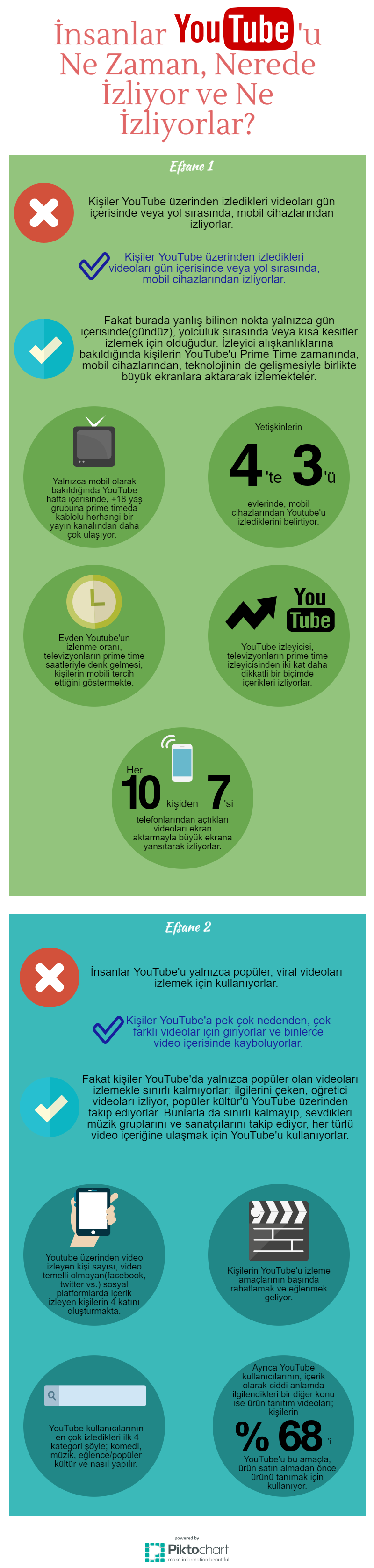 İnsanların youtube üzerinden izleme alışkanlıklarına bakıldığında aslında büyük bir yanılgı içerisinde olduğumuzu görmek mümkün. Bunun nedeni ise yanlış bilinen doğrular. insanlar nerede nasıl ne zaman YouTube’dan içerik izliyorlar mitlerinin yıkılmasını sağlayacak istatistikler Google tarafından bu infografikte iki başlık altında işlenmiş.